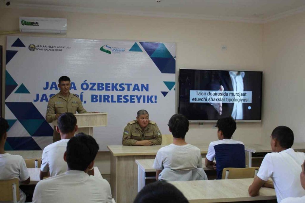 🔸Jaslar aylıǵı sheńberinde Nókis qalası 1-sektor aymaǵında jaylasqan Respublikalıq Milliy gvardiya aymaqlıq oqıw orayı imaratında jaslar arasında “Mártlik sabaqları” hám huqıqıy-psixologiyalıq másláhátler ótkerildi.